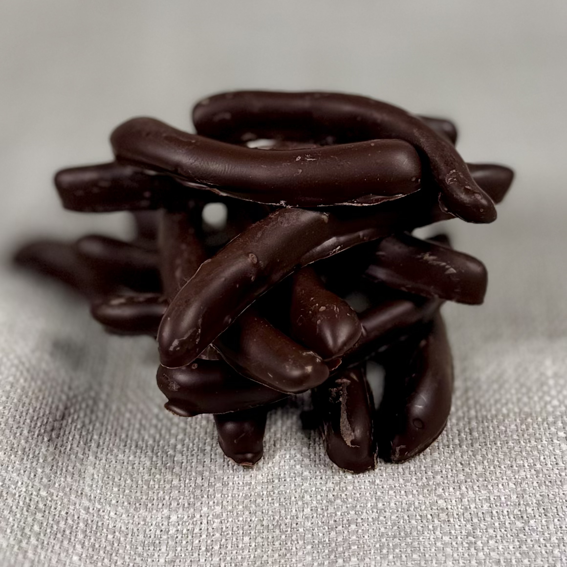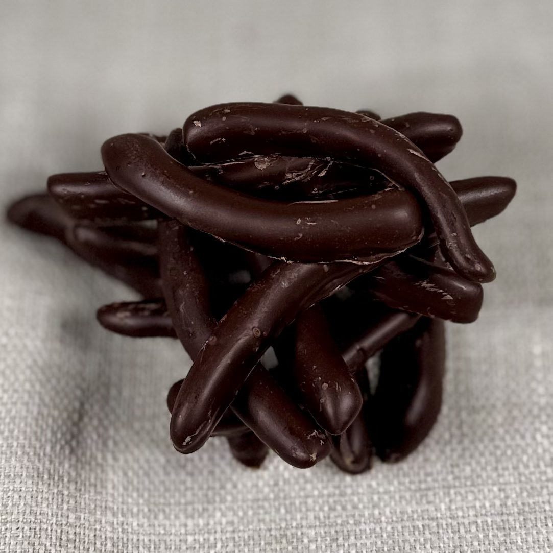 Kandierte Orangenschalen, getaucht in Zartbitter Schokolade.